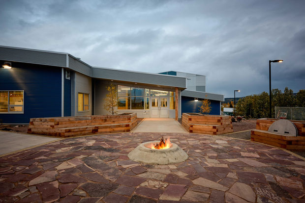 The project also included an extensive landscaping component which provided the school with native plant beds, three exterior playground zones, a tipi platform, and a ceremonial fire feeding circle for cultural events, constructed from locally sourced stone pavers.