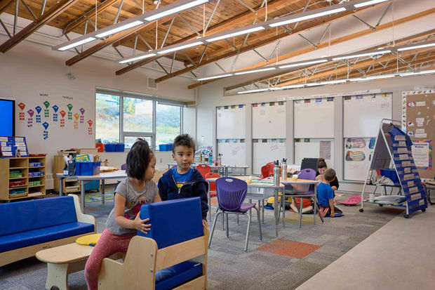 TAG reorganized the K-12 school into three “neighbourhoods” to create separate zones for the different age groups: primary school, middle school and high school. The central corridor was expanded in order to create break-out zones to be used by students for informal gatherings and group work. Glazing between the classrooms and the corridor provides passive supervision to these areas and allows additional natural light to filter into the classrooms. The gymnasium was opened up to the rest of the school with a large glass viewing wall, and a central library with movable lounge furniture was designed for both school and community use.